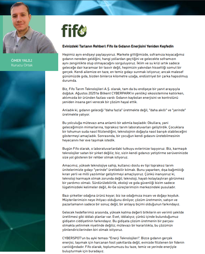 Fifo Tarım Teknolojileri A.Ş., 2025’te Bilkent CYBERPARK’ta kurulan bir tarım teknolojileri girişimidir. Amacımız, gıdayı yerinde üretilebilir kılacak topraksız tarım çözümleri geliştirerek; sürdürülebilirlik, sosyal denge, gıda güvenliği, ekoloji ve teknoloji odağında yüksek verimli ve kullanıcı dostu sistemleri herkes için erişilebilir hale getirmektir.